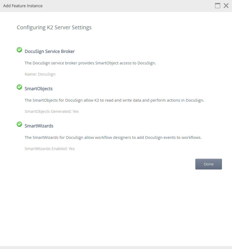 - The product will then configure feature instance by creating a Service Instance, SmartObjects and enabling the DocuSign workflow wizards.