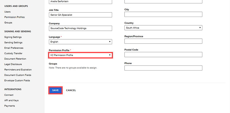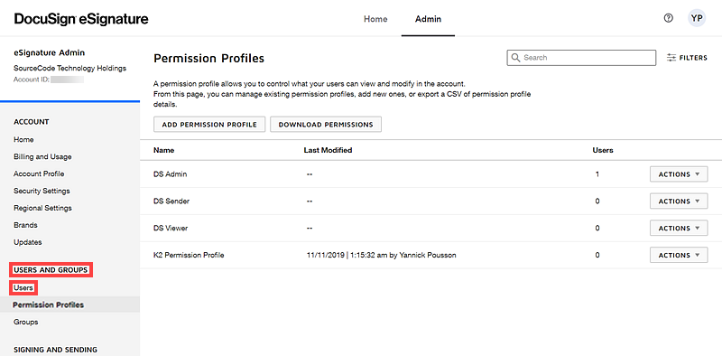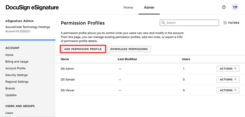 You can assign these permissions to existing permission profiles in DocuSign, or create a new permission profile in DocuSign, and assign the new permission profile to the relevant users who need to use DocuSign integration through the product.