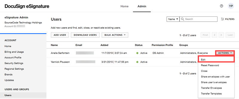 - On the Users page, select the user for the permission profile, click Actions and then Edit.