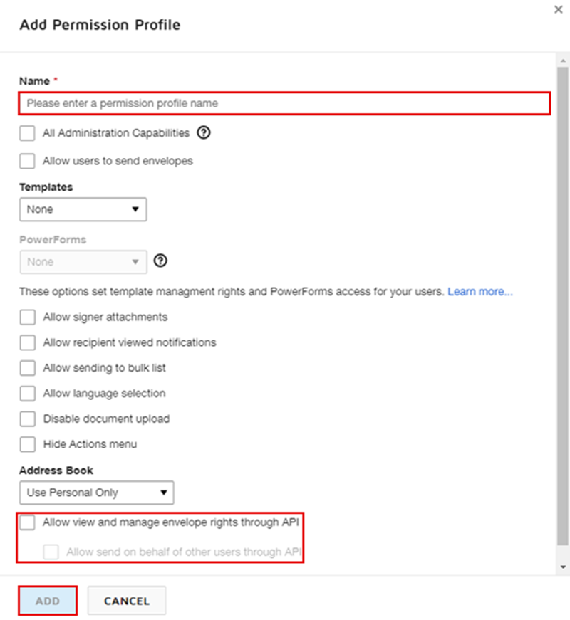 - On the Add Permission Profile page, provide a Name for your permission profile, select Allow view and manage envelope rights through API and Allow send on behalf of other users through API. Click Add.