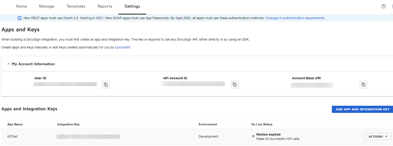 Select the Use the K2 Integrator Key option, however if you are using a non DocuSign production instance, you will need to provide your own DocuSign Integrator Key that is valid for your DocuSign tenancies. Regardless of the Integrator Key option selected, you will need to provide the REST API URL, Account ID, User Name and Password for your DocuSign Account. After October 4th 2022 , all non OAuth 2.0 authentication flows will be fully deprecated, it is recommended for users to use OAuth.
