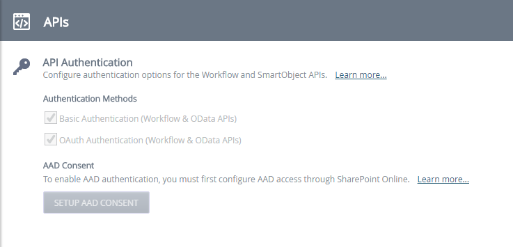 You must set up Azure Active Directory permissions before you can enable the APIs. See Azure Active Directory consent for more information. You do not need Azure Active Directory consent with Nintex Automation using Active Directory.