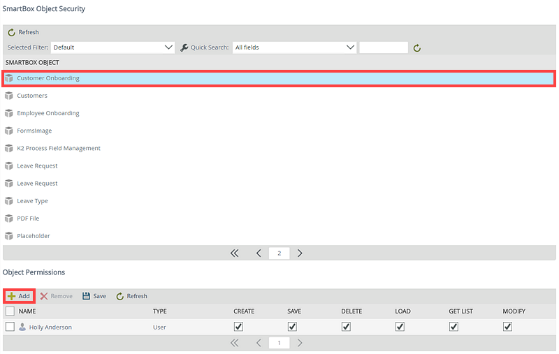 On the SmartBox Object Security page, select the SmartBox-based SmartObject that you want to configure permissions for. The Object Permissions view opens. Click Add.