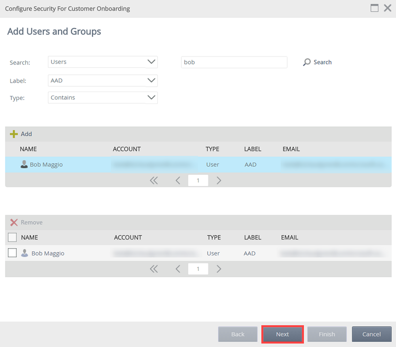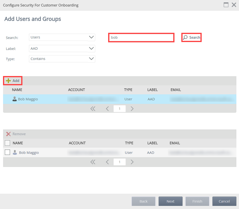 - The user or group will now be listed in the second view. You can add multiple users or groups by doing a new search and clicking Add again.