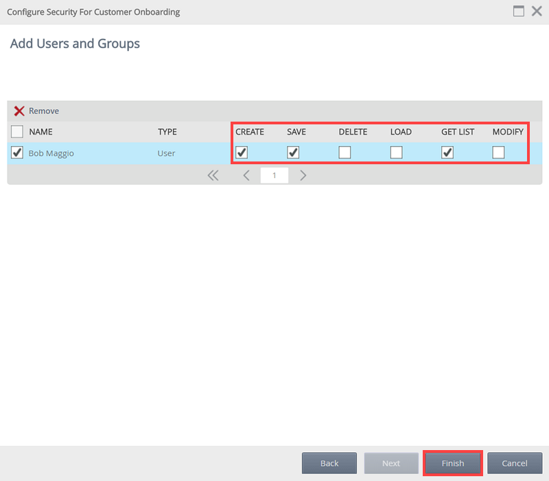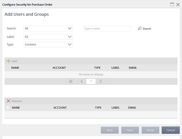 - The Configure Security for [SmartObject] page opens. From this page you will select the users/groups that you wish to configure permissions for.