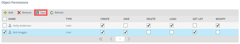 The Save button is used to save changes made to existing object permissions. To edit permissions, the check boxes can be checked or unchecked per user or group. Click Save to save the permission changes made.