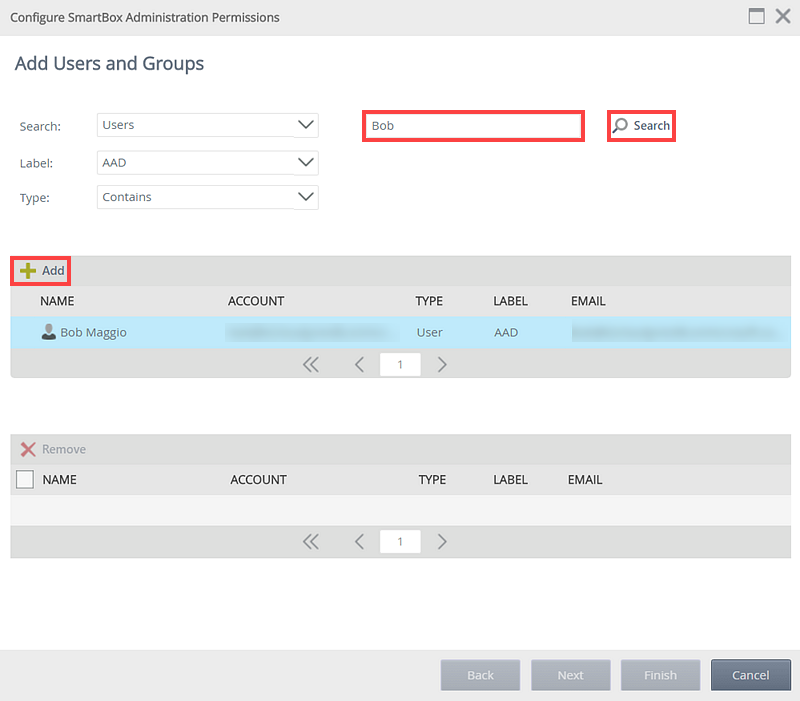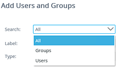 - The Configure SmartBox Administration Permissions page opens. Click the Search drop-down and select to search for users or groups.