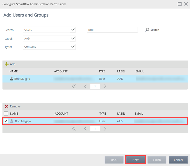 - The user or group will now be listed in the second view. You can add multiple users or groups by doing a new search and clicking the Add button again. Click Next.