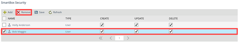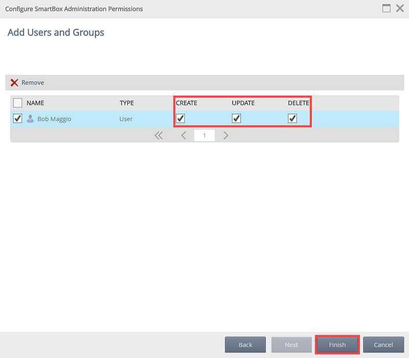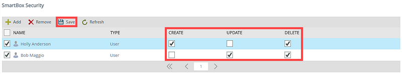 Permission Level What does it allow the user to do? Create Allows the user/group to create and deploy new SmartBox-backed SmartObjects. Update Allows the user/group to update the definitions of existing SmartBox-backed SmartObjects. Delete Allows the user/group to delete existing SmartBox-backed SmartObjects.