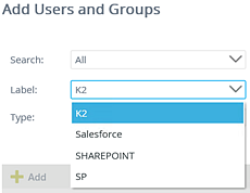 - Type a value in the text box provided and click the Searchbutton. The matching users or groups will be returned in the first view. Select a user or group and click Add.