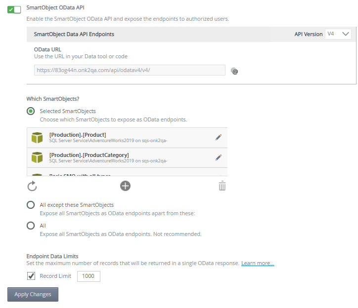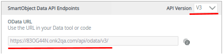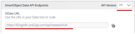 Select the SmartObject OData API version to use on your system. When you select OData v4, the OData URL changes. The OData URL is the URL used to access SmartObjects via OData. Click on the