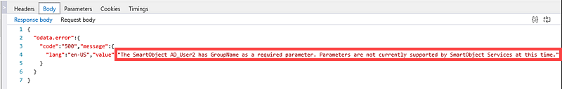 - Using input parameters in SmartObject list method calls do not work with the SmartObject OData Service API, doing so results in the following error: