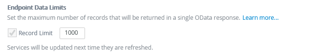 The Record Limit defaults to 1000 records. You can turn off or adjust the value of this cap. Configure the record limit to a positive number between 1 and 999,999,999. If you enable the data limit and the response to the OData request exceeds the record limit, the response includes a next link. Use the next link to retrieve the next set of records.