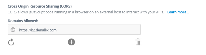 Click on the plus icon to add a new domain. Select a domain and click on the trash can to delete it. Click on the refresh icon to reload the list of allowed domains.