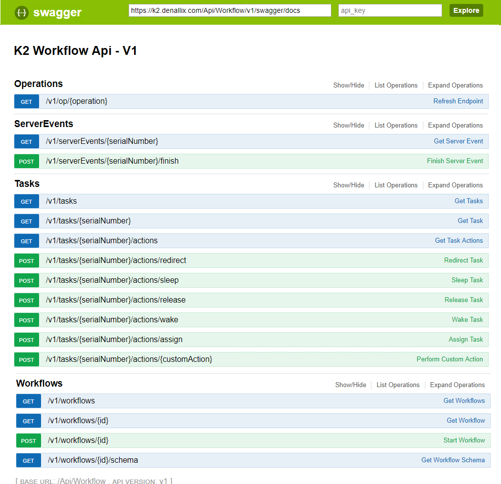Click on Open Link to open the K2 Workflow Api swagger page and access the list of operations, tasks, and workflow functions.