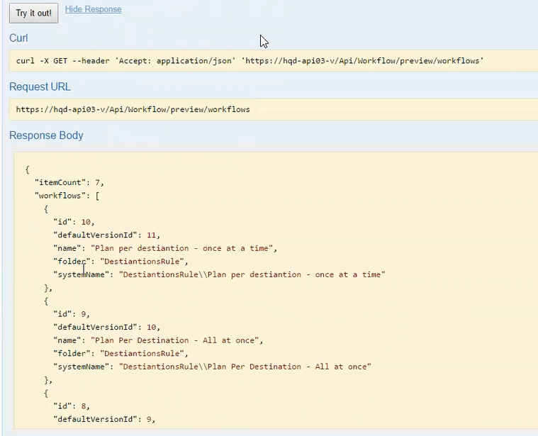 You can use the Try it out! button on the swagger page to get a JSON response from the web service. For example, the Get Workflows GET function will return the number of workflows on the server, and give the id, defaultVersionID, name, folder, and systemName values for each workflow.