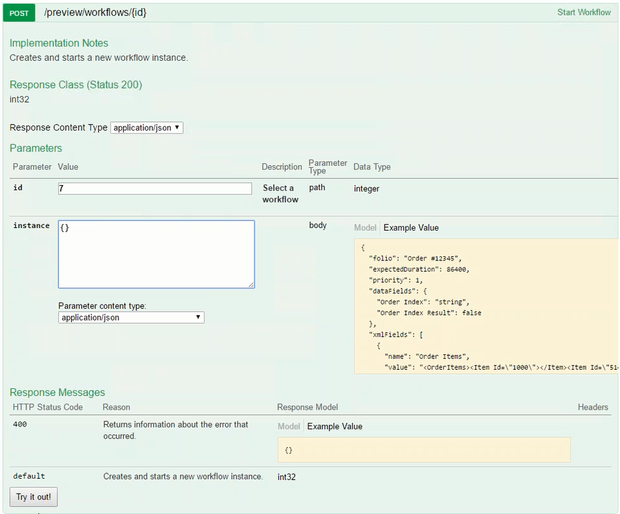 A POST swagger function may require parameters and instance data. For example, the Start Workfow POST function needs the workflow id number. Body values can be entered; use the Example Value JSON examples to guide your construction, or use empty brackets {} to enter no data. Add data fields, XML fields, and item references where needed. A full schema of a workflow is available from the GET workflows/{id} function. The GET workflows/{id}/schema function provides JSON schema formatted as a string ready for Microsoft Power Automate.