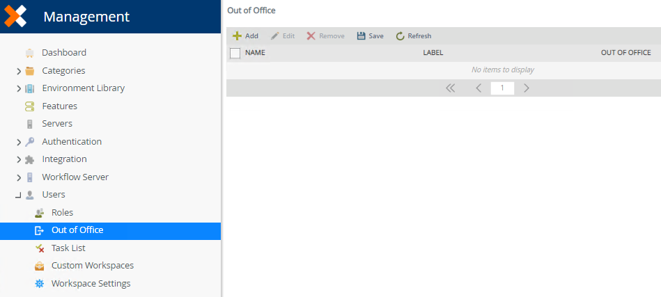 The Out of Office node is used to list and change users' out of office status, and to configure a user's out of office settings on their behalf. For example, you may need to set up out of office delegation rules when an employee is absent from work, so that their task list items are shared with other users who can complete the tasks on their behalf.