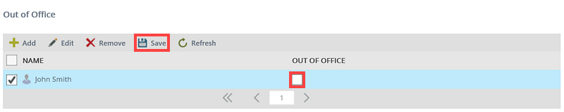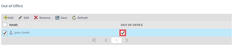 - Click the check box under the Out of Office column to set the user as out of office and activate the delegation rules.