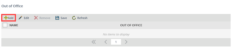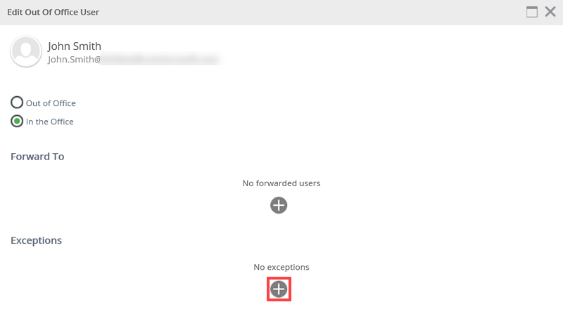 - On the Edit Out of Office User page, click the + icon in the Exceptions section.