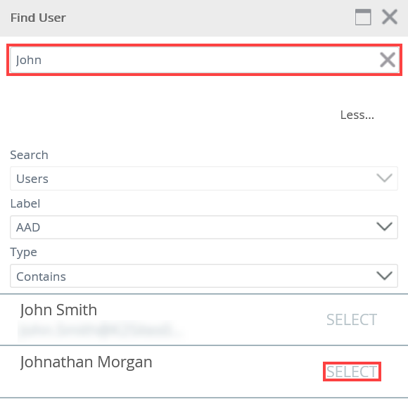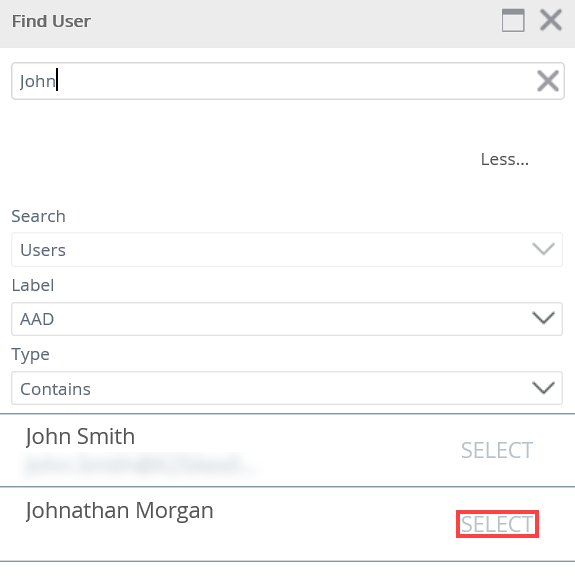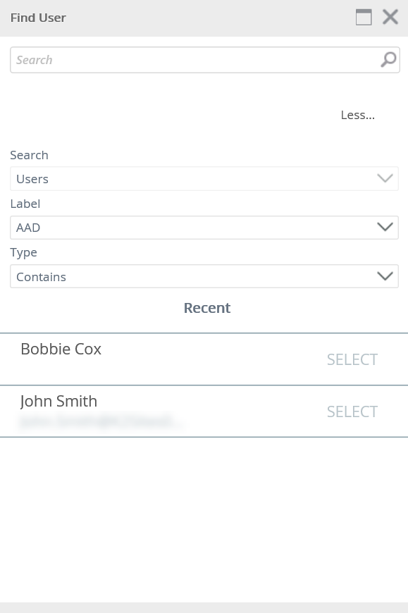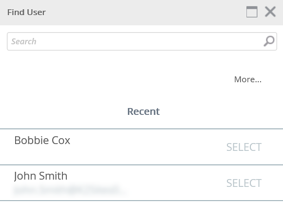 - Next, the Find User screen will open. Here the required user can be searched for. Additional search options can be applied by clicking the More... link, or select the user from the Recent section.