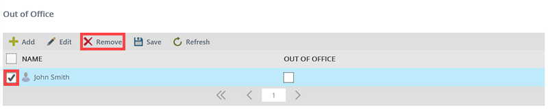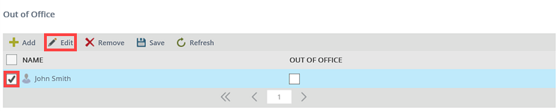 - On the Out of Office page, select the required user via the check box and click Edit.