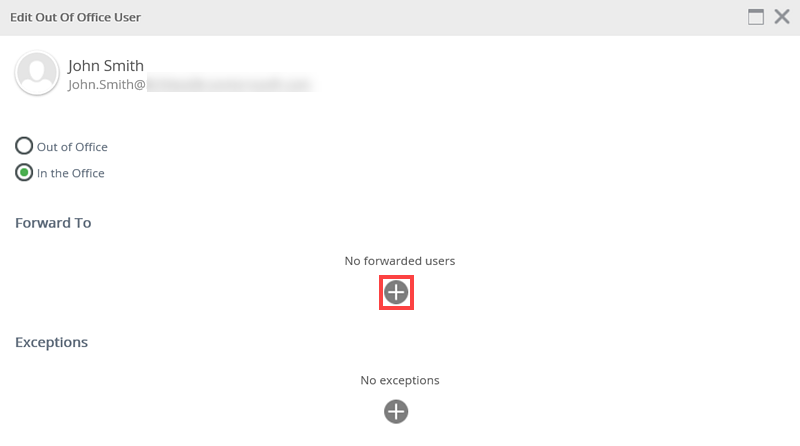 - The Edit Out of Office User page will appear. In the Forward To section, click the + icon.