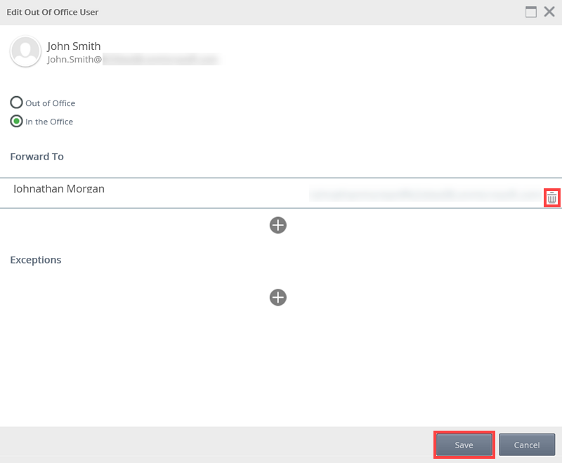 - On the Edit Out of Office page in the Forward To section, click on the Trash Can icon next to the user.