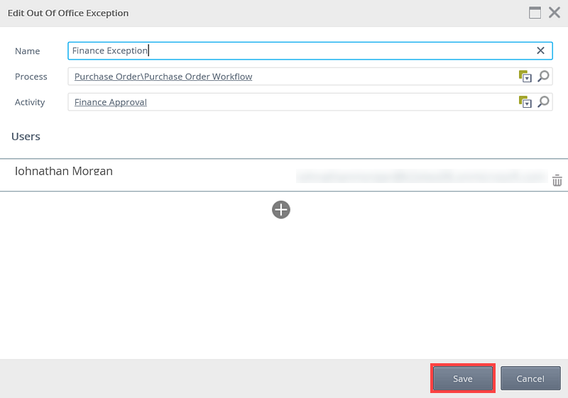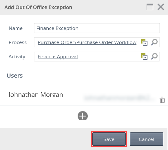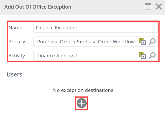 - On the Add Out of Office Exception screen, provide a name for the exception and use the search boxes to select the process and activity that the exception should apply to. Then, in the Users section, click the + icon.