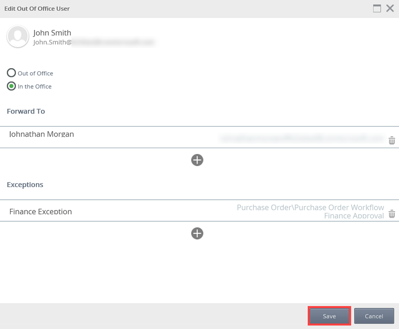 - On the Edit Out of Office User page, click Save to commit the exception configuration