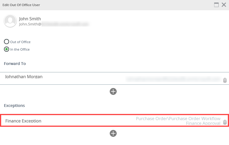 Exceptions are applied when the out of office user wishes to direct tasks of a particular type to specific destination user(s). While the user is out of office, any items meeting the exception rule will be forwarded to those user(s) specified in the exception rule only, while all other tasks will be forwarded to the user(s) listed in the main out of office configuration. You can add, edit or delete exception rules.
