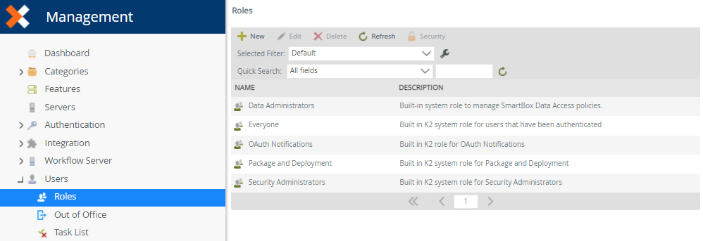 Use the Roles node to create, edit, delete or save roles. Roles are essentially groups defined in the product, and are most often used for assigning tasks or setting security. For example, perhaps it is not possible to define groups in Active Directory (AD) for workflow task allocation, because the AD administrators are unwilling to define groups used only by applications. Or perhaps you to create a group that contains users authenticated through different authentication mechanisms, in which case you cannot define the group in AD.