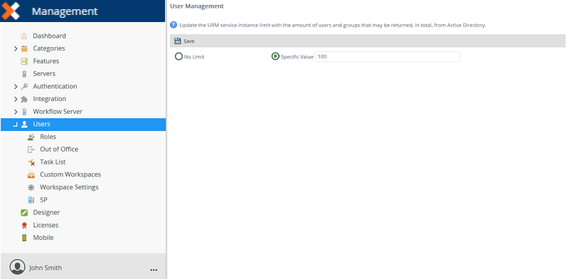- On the User Management page, select either the No Limit or Specific Value option to configure the amount of users and groups that may be returned from Active Directory.