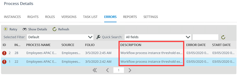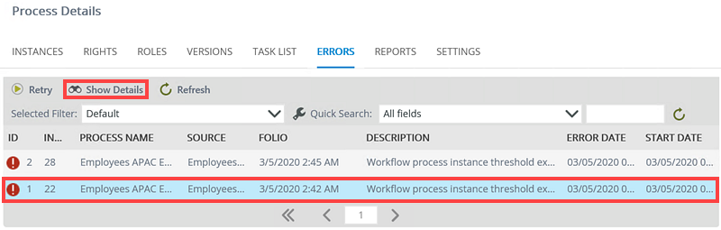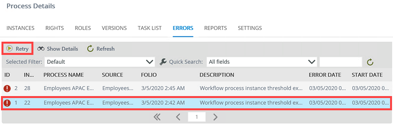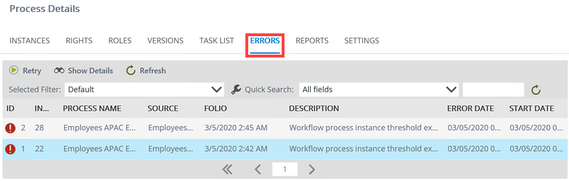 The Errors tab in the Process Details screen allows a administrator to view, retry, show details and refresh instances of the currently selected workflow that are in error state