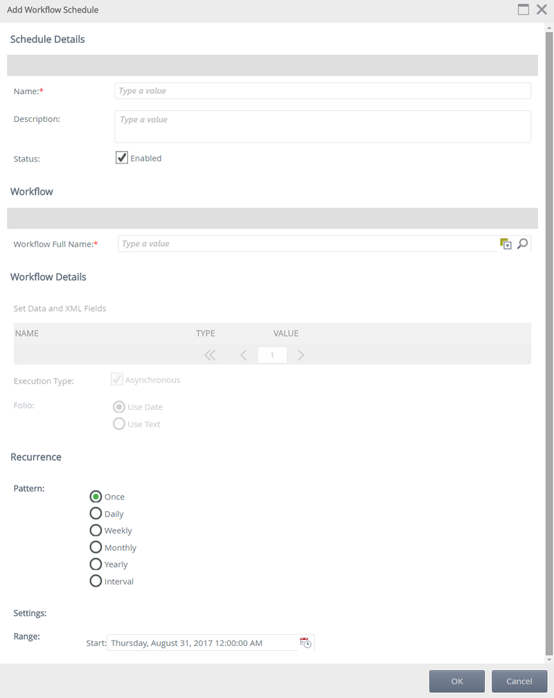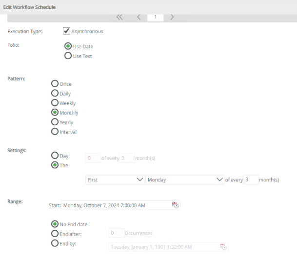 | Settings | The Settings section depends on the pattern selection made and will be different for each available pattern. Configure the settings according to the recurrence pattern selected. This will determine how often and when the workflow should be started. |