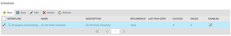 The Schedules node allows you to create and edit schedules that will automatically start an instance of a workflow at a particular date in the future, or some type of recurring pattern (e.g. once a week). For example, you may have an Audit workflow that needs to start automatically once a month. Setting up a schedule for this workflow to start automatically means that you do not have to remember to start the workflow manually each month.
