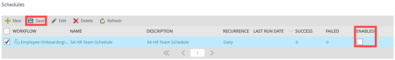 The Save button is used when changes were made to the Enabled check box of a schedule. After checking or unchecking the check box, click Save to update the schedule with the new status.