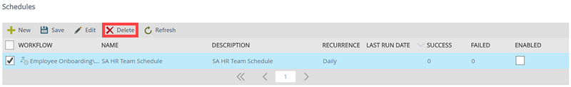- Select the schedule you want to delete by clicking the check box in front of the schedule. (You can also click the check box next to Workflow if you want select all the schedules at once.)