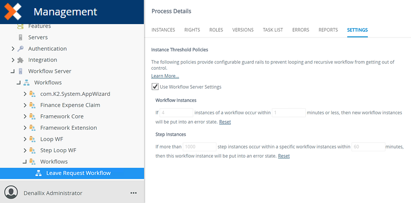 - By default, workflows inherit instance threshold policy settings from the Workflows node's Settings tab. You can disable this by unchecking the Use Workflow Server Settings setting. For the purpose of this example, the Use Workflow Settings check box is deselected.