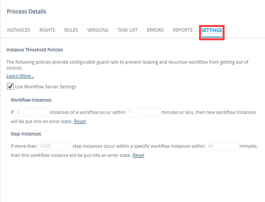 The Settings tab allows you to configure and manage Instance Threshold Policies on a workflow in your environment. Instance threshold policies help prevent looping and recursive workflows from entering a loop state and causing server performance degradation.