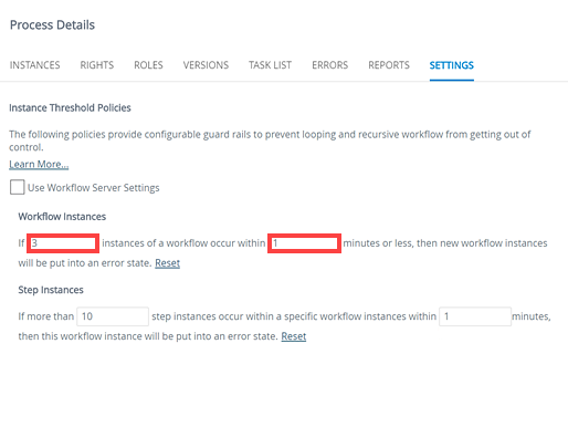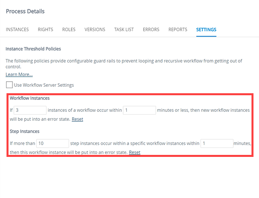 - The Workflow Instances option allows you to configure a policy setting that, if a certain amount of workflow instances are started within a certain amount of time (in minutes), then any new instances are put into error state.