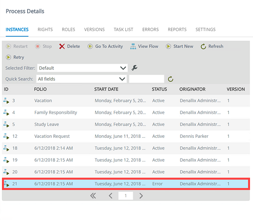 - When the workflow breaks the policy, new instances are placed into error state . For the purpose of this example, a Leave Request Workflow is used. The workflow exceeded the Workflow Instances option of the policy and the instance that exceeded the policy goes into error state. The first three instances executed successfully but the fourth instance went in to error state as per the policy.
