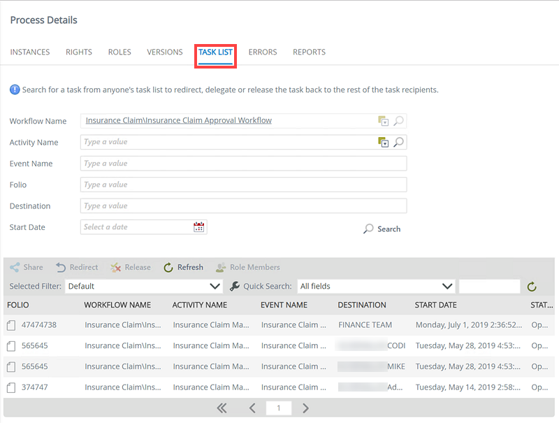 The Task List tab in the Process Details page allows you to search for tasks (also called worklist items or task list items) in the current workflow definition, and to share (delegate), redirect or release task items related to the current workflow.