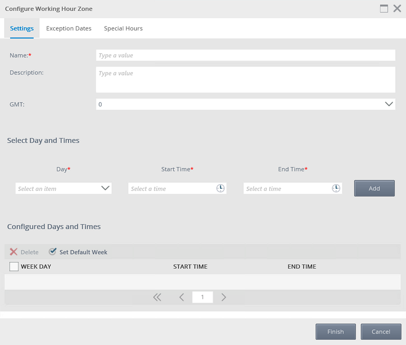 | Finish | Click Finish if you want to complete the configuration or select the Exception Dates or Special Hours tabs if you need to further configure the working hour zone. |