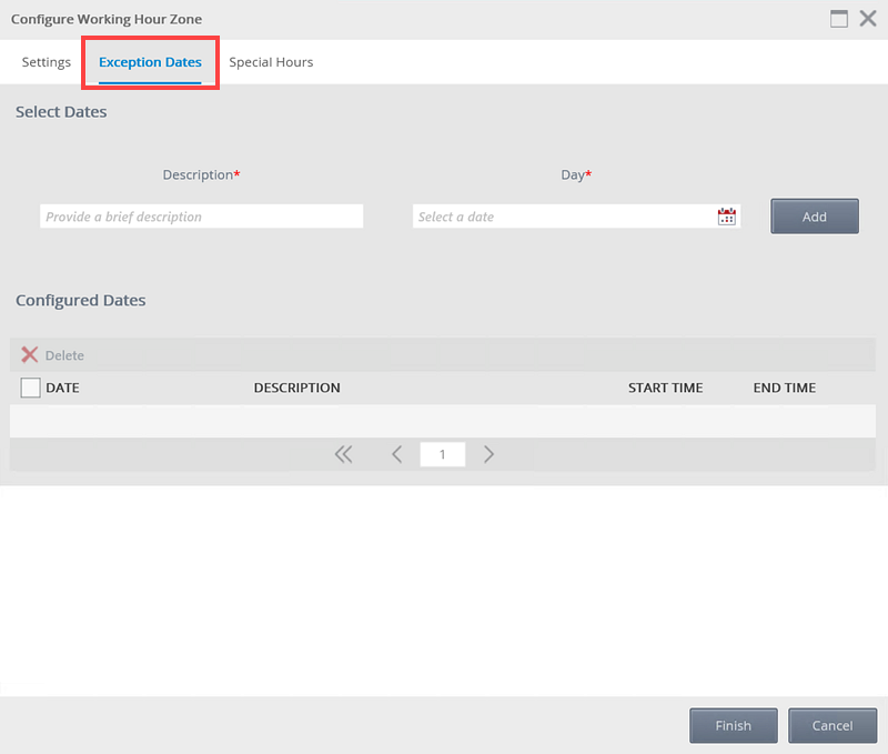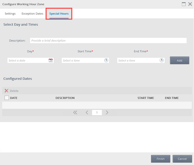 Click Finish after configuring the exception dates or click the Special Hours tab to configure more options for the working hours zone.