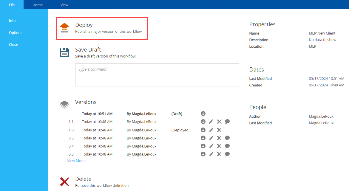 Clicking Save Draft in the File>Info tab of the ribbon allows you to save a draft (minor) version of the workflow. You can use this for testing purposes while designing your workflow. It is good practice to add a comment to the draft version to state what has changed for the next person working on the workflow. Example comments: