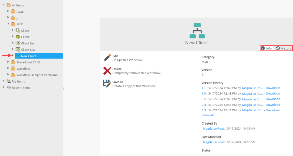 Clicking an existing workflow in the Designer allows you to see the properties of a workflow. It contains two tabs; Info and History.