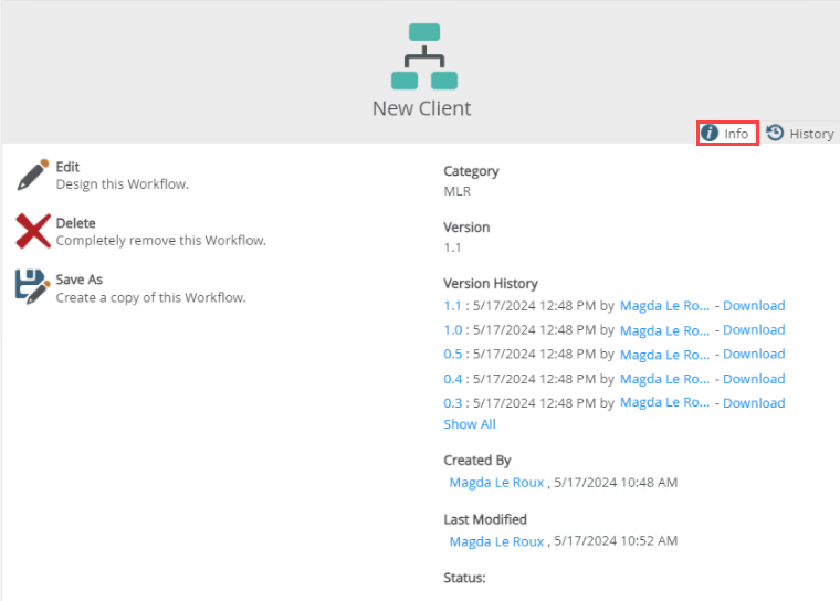 The Info tab allows you to perform actions such as Edit, Delete, and Save As. You can also see the current version of the workflow and download previous versions from here. These are design time versions and can be minor or major versions.