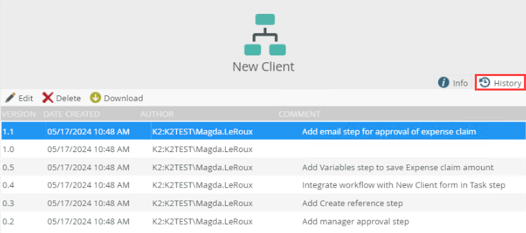 The History tab shows the history of design time versions created for the workflow in descending date order, with the most recent version at the top. From here you can see the details of the version and edit, delete, or download a specific version. To manage runtime versions of a workflow, see the Versions topic in Management.