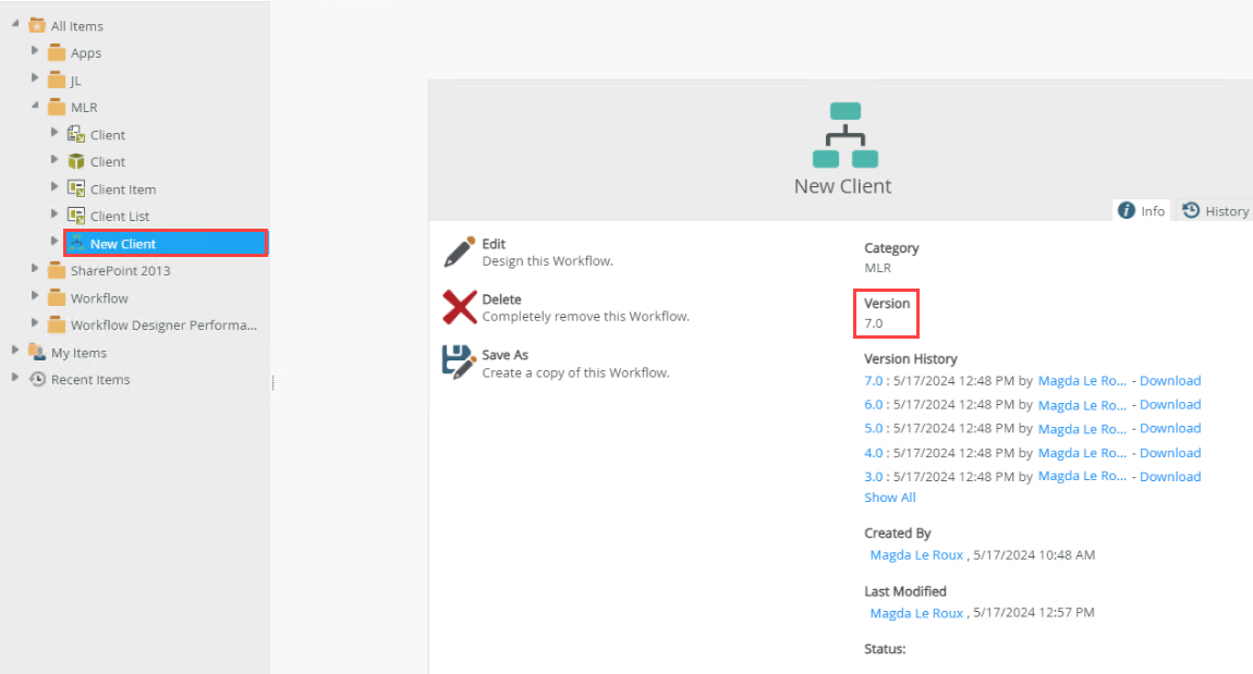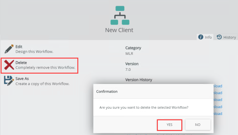- Using the Designer, select the workflow and click Delete to delete the last saved version of the workflow, in this example we are deleting version 7.0. Click Yes to confirm.